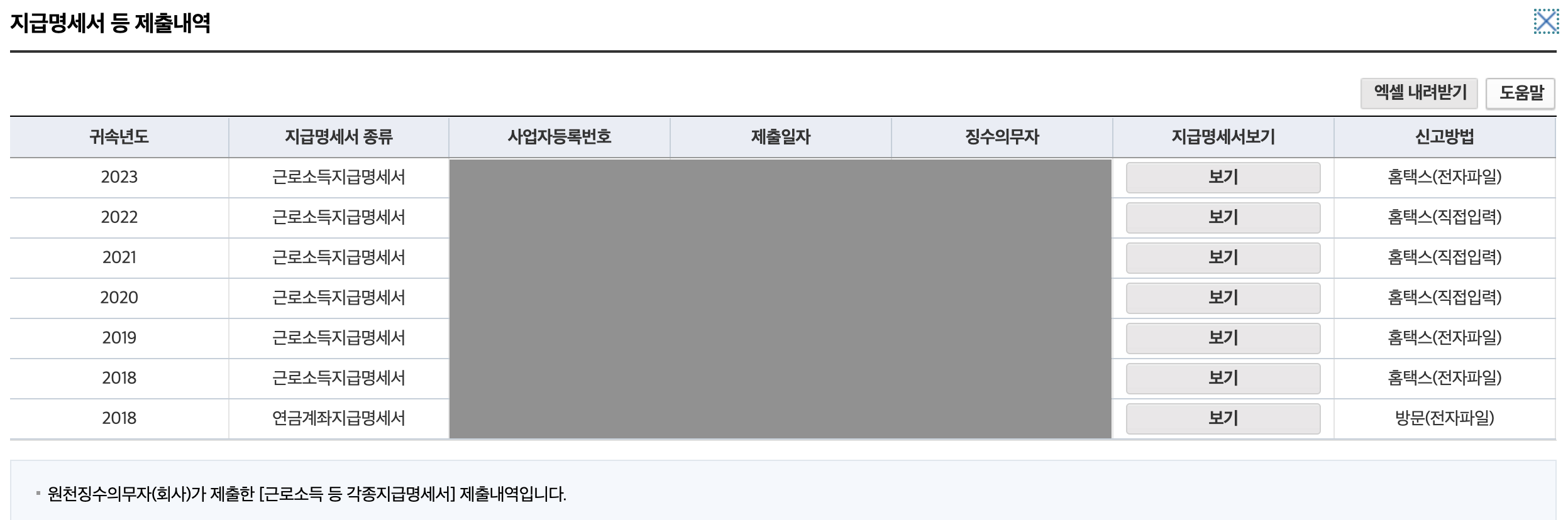 - 귀속년도별로 지급명세서 종류, 사업자 등록번호등이 나오는데 필요하신 년도를 찾아 ‘보기’를 클릭해 주십시오.