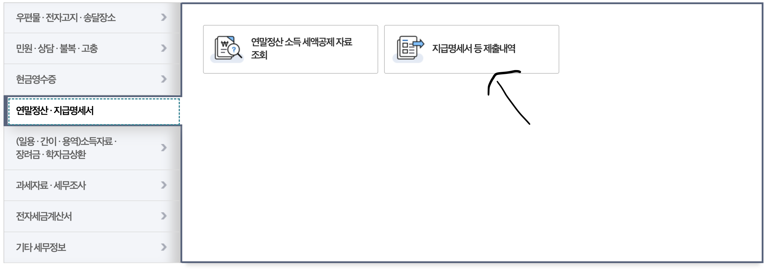 - 마이홈택스에 들어가셔서 연말정산 지급 명세서 탭의 지급명세서 등 지출 내역을 클릭해 주십시오.