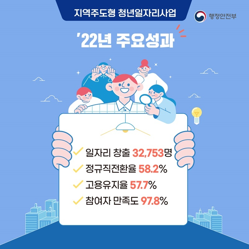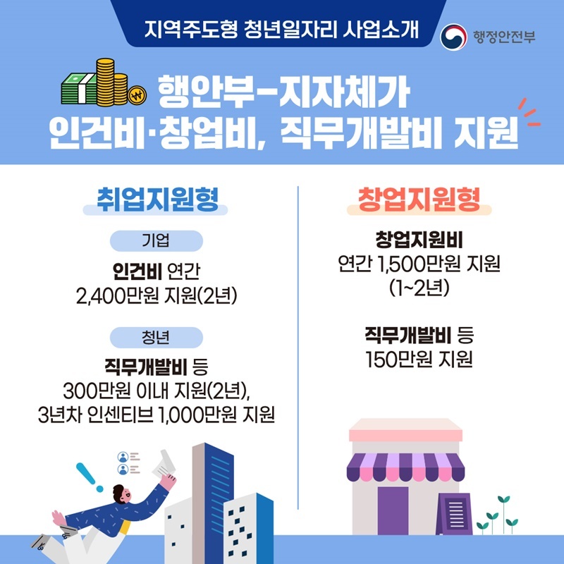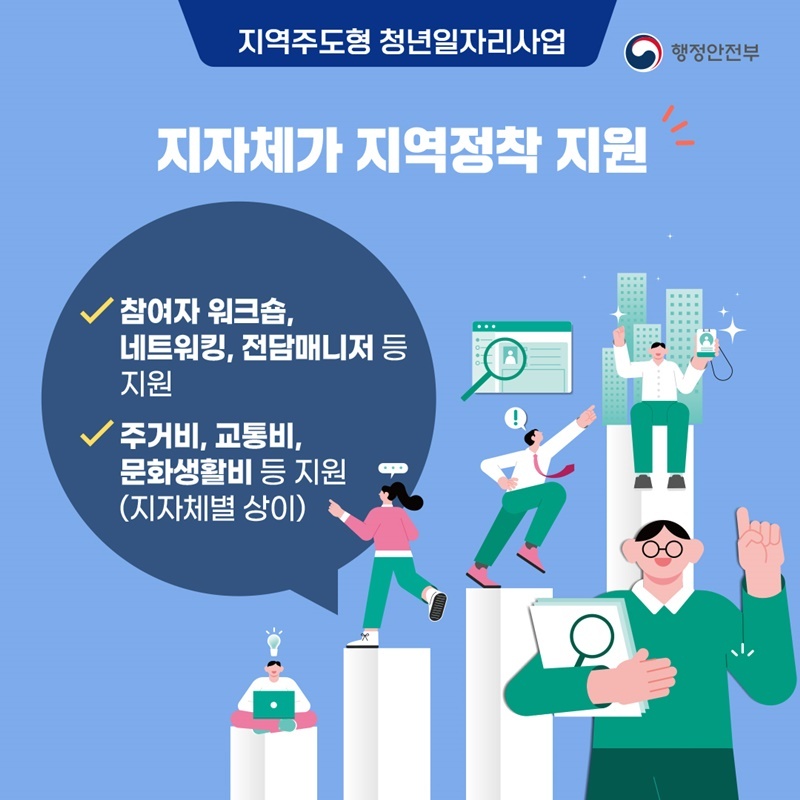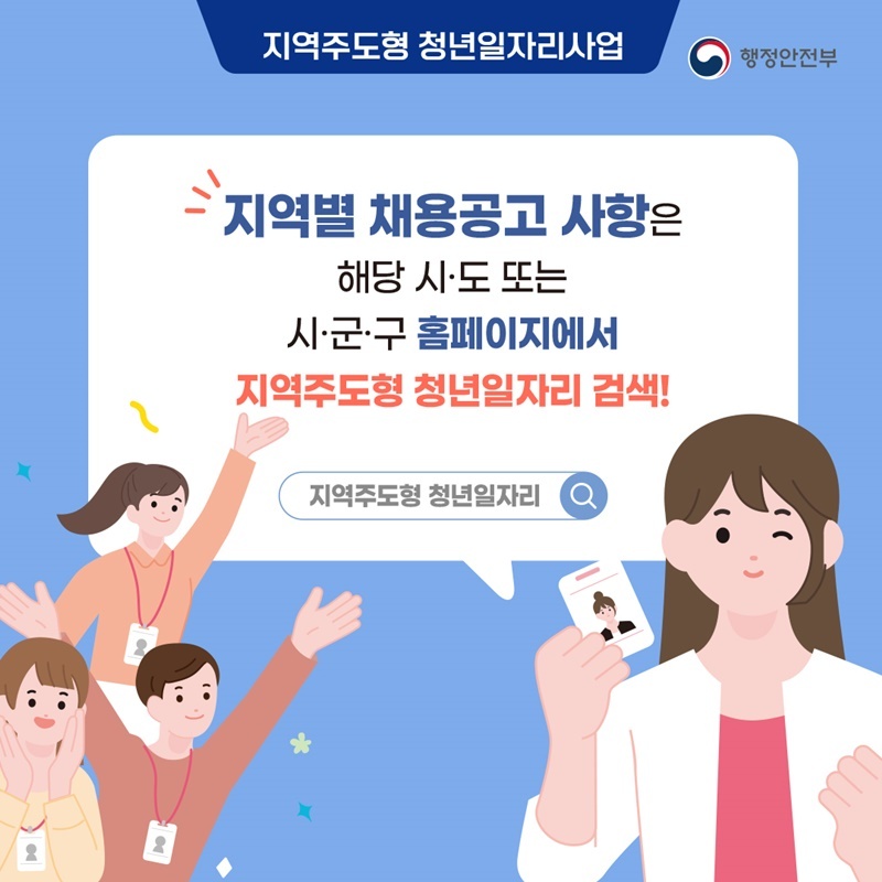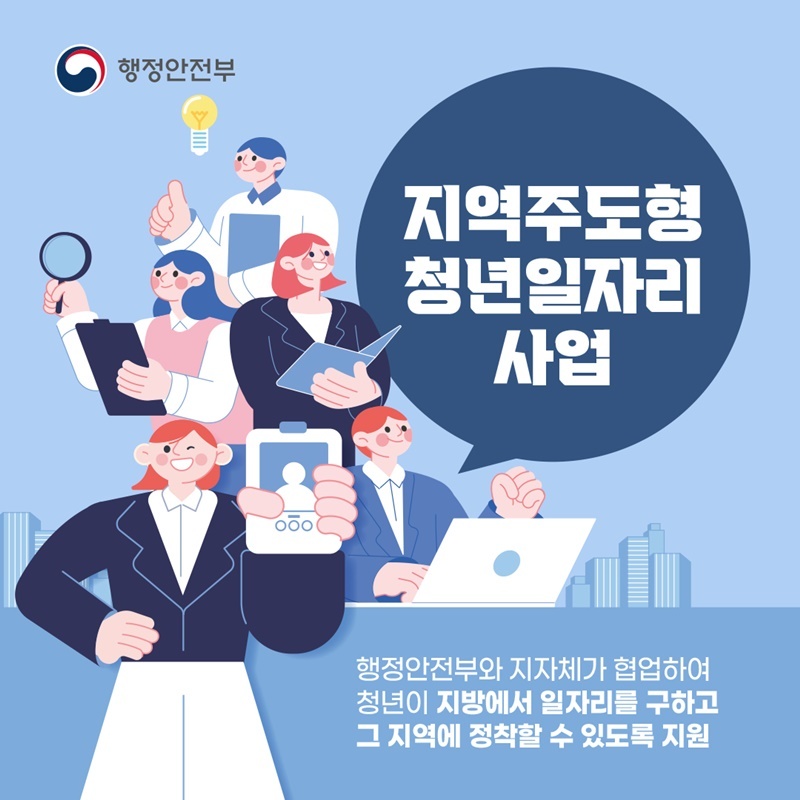 청년정책사업의 하나인 지역주도형 청년일자리 사업은 행정안전부의 지원을 받아 지역 현장을 가장 잘 이해하는 지자체가 지역 청년일자리 창출을 위해 운영하고 있습니다.