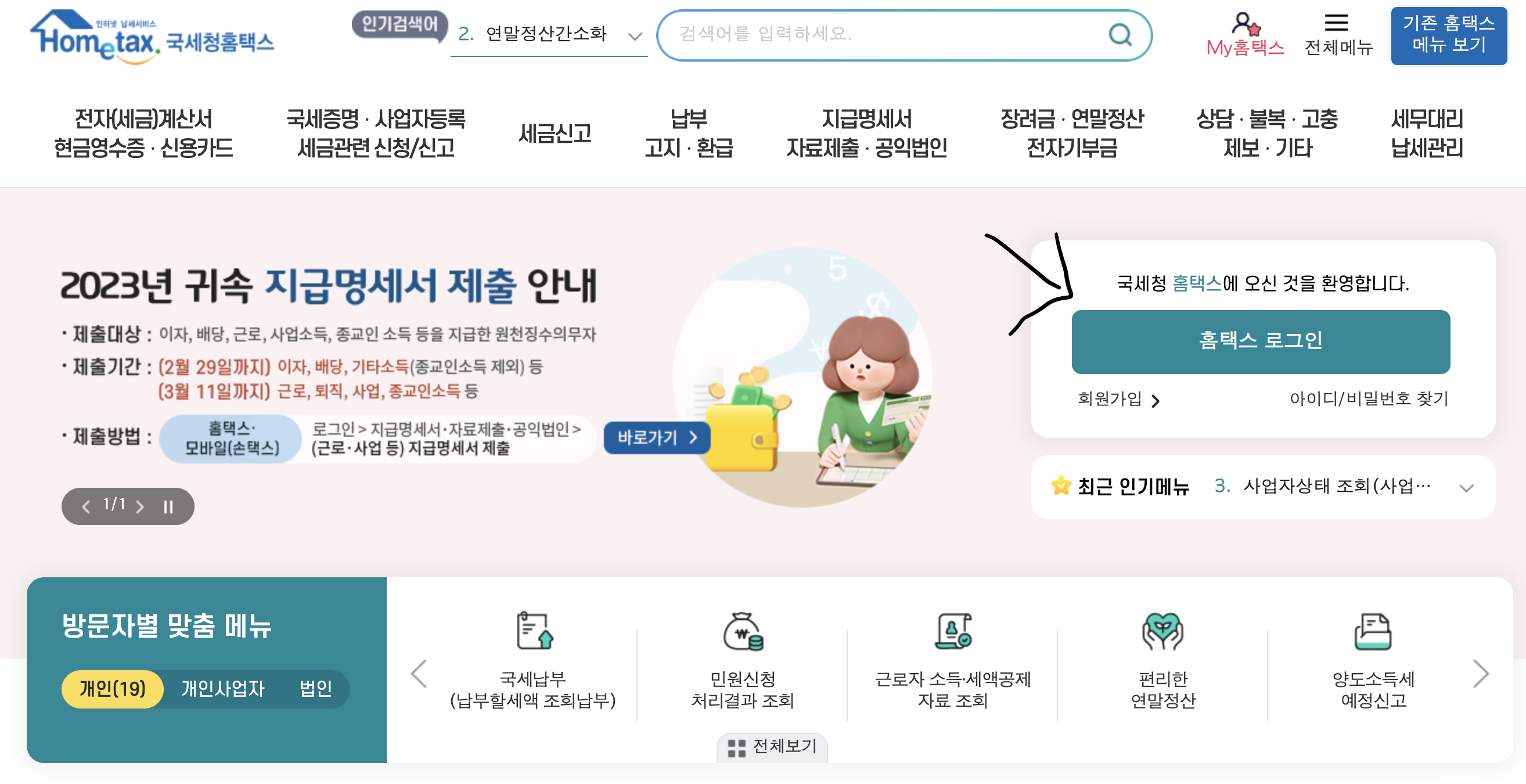 - 홈택스를 들어가셔서 로그인을 먼저 진행해 주시기 바랍니다.